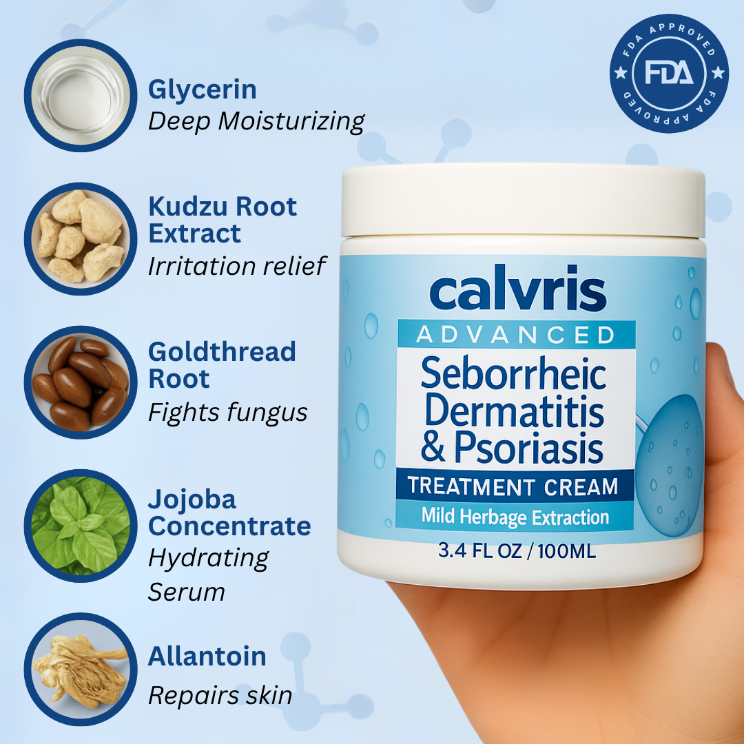 Calvris uses 5 clinically backed natural ingredients that work together to soothe irritation, eliminate flakes, fight fungal overgrowth like Malassezia, and restore your skin barrier, without the use of steroids or harsh chemicals.