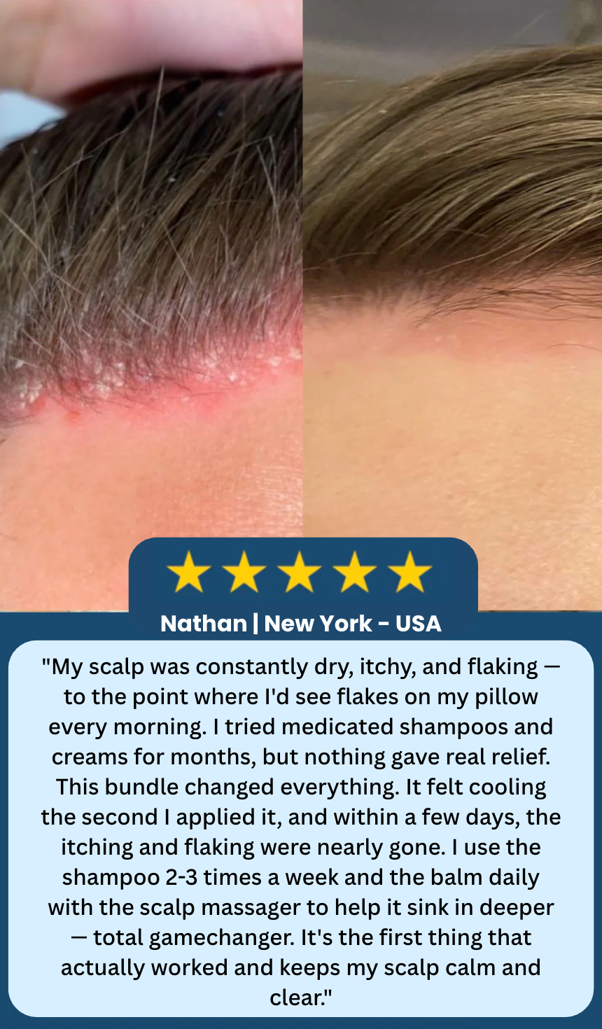 The shampoo (with 1% ketoconazole + herbal extracts) kills the fungus at its source. The balm (with 5 lab-tested actives) rebuilds your skin's natural defense. Each ingredient targets a root cause, so you're not just covering up symptoms — you're fixing the problem where it starts. That's the power behind our complete system, designed to treat the real culprit, not just provide temporary relief.