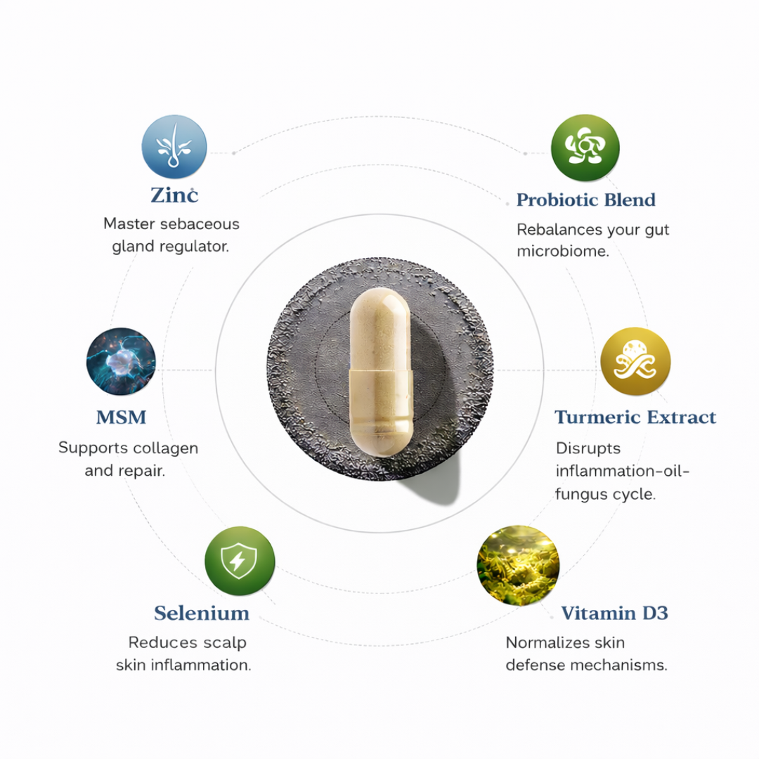 The master regulator of your oil glands. Zinc tells your sebaceous glands to stop overproducing oil before it even reaches your skin. No excess oil means nothing for the fungus to feed on. Studies show that low zinc levels make dandruff and seb derm worse—this dose fixes that deficiency.